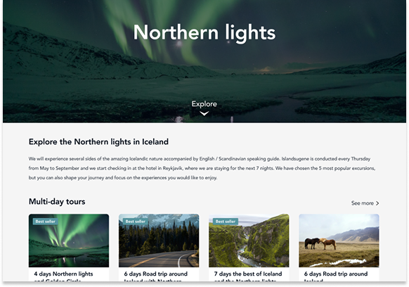 A couple of years after, the client contacted me again to work on some new add-ons. During the pandemic, with nobody traveling due to the lockdown, the owner of Hekla decided to go big and make of Hekla the Amazon of trips and excursions. They wouldn’t only sell their own products, but allow other companies to sell their trips in this platform. That meant that we had to make some adjustments to the design to market better the different locations.